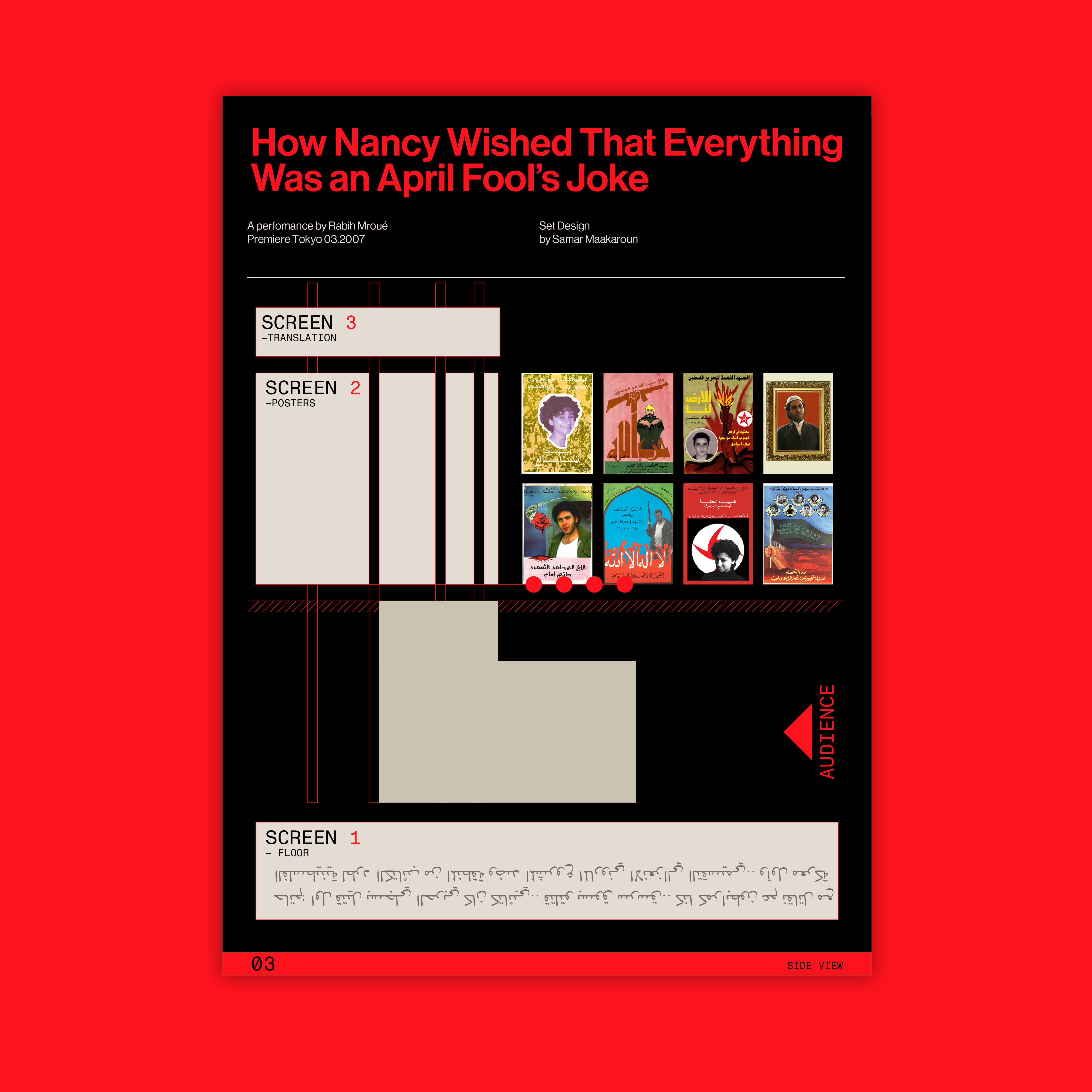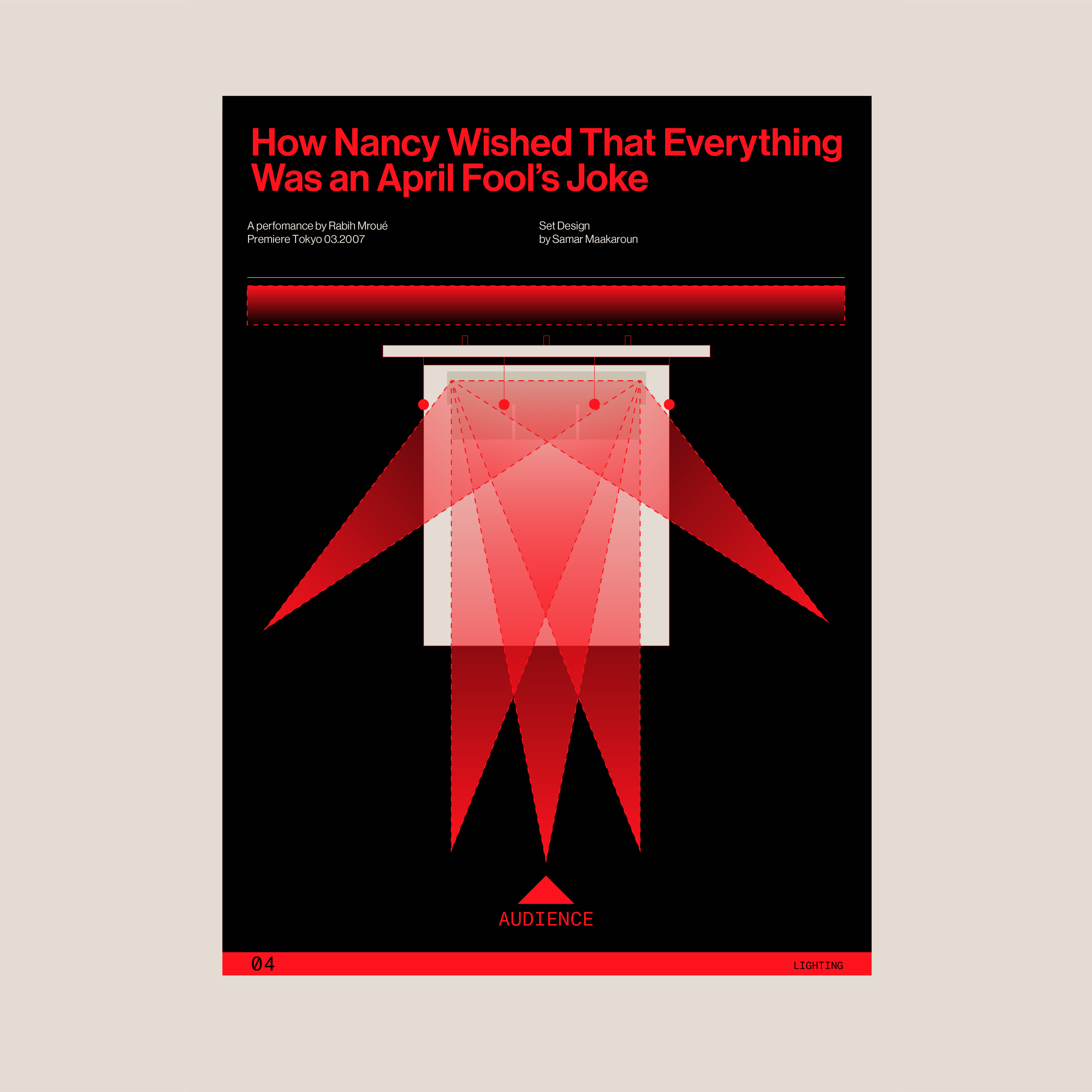 Between 2003 and 2018, I worked with director Rabih Mroué, designing stage sets and promotional imagery for numerous theatrical productions, including So Little Time (2017), 33 RPM Per Second (2012), Photo-Romance (2009), How Nancy Wished that Everything Was An April Fool’s Joke (2007), Who’s Afraid of Representation (2004), Looking for a Missing Employee (2003).